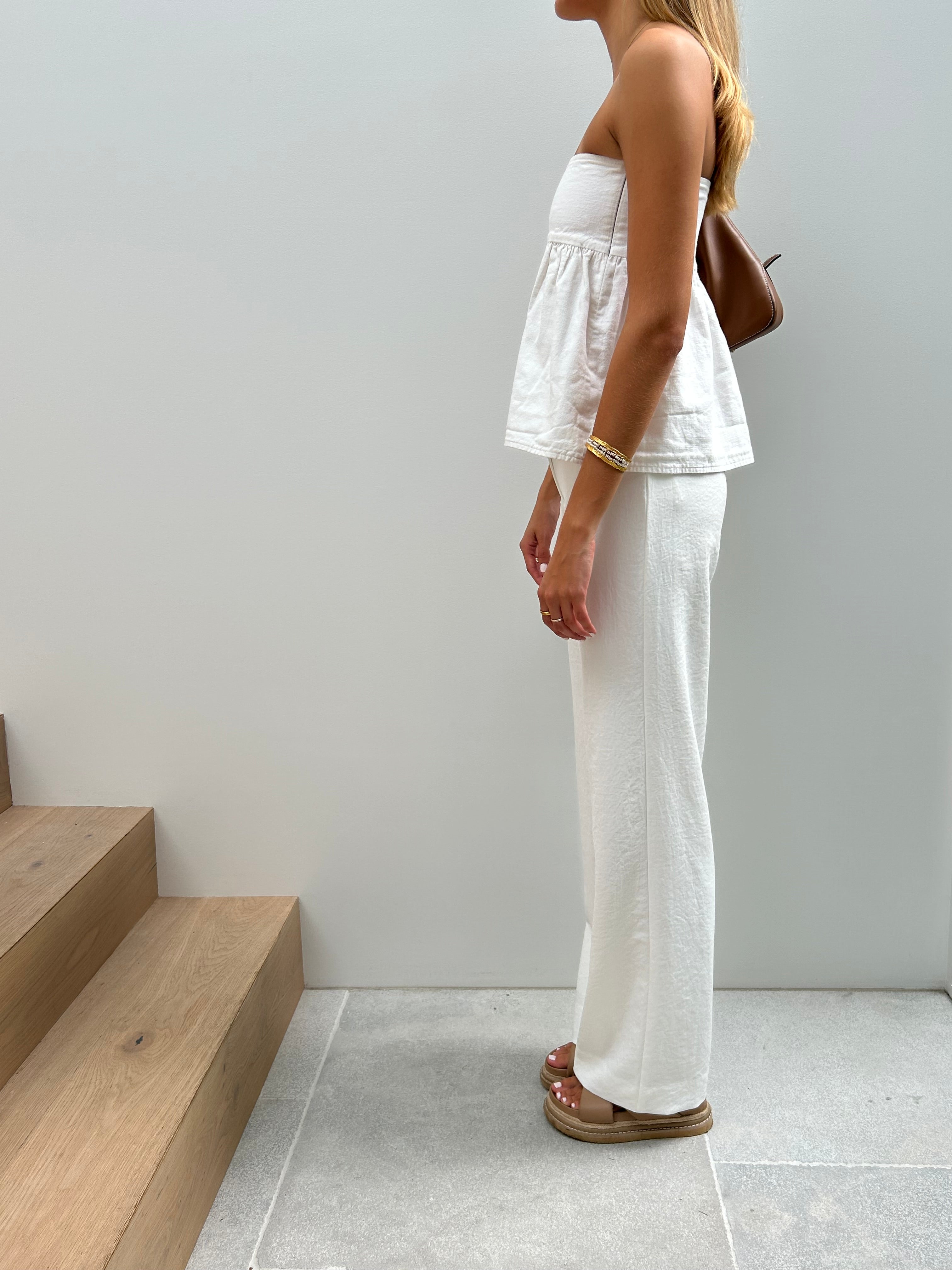 The Charlotte Top is a strapless top made from a thick double-lined linen-cotton blend with closed seams (60% Linen, 40% Cotton)